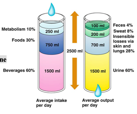 *most water lost in urine, second most via insensitble losses via skin and lungs then sweat and feces