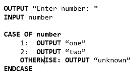 Write an algorithm using a case statement that asks the user to enter an integer. If the number entered is 1 or 2 it should output “one” or “two” respectively. Otherwise it should output “unknown”.