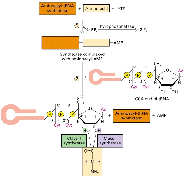 The genetic code is translated by means of two adaptors that act one after another. What are these and what do they do?