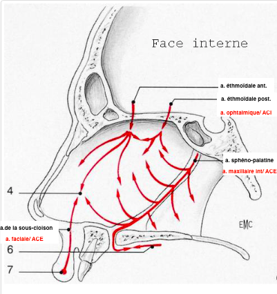 ETHMOIDALE ANTERIEURE => branche de l’a. ophtalmique => carotide interne Risque = OACR (cécité), risque AVC