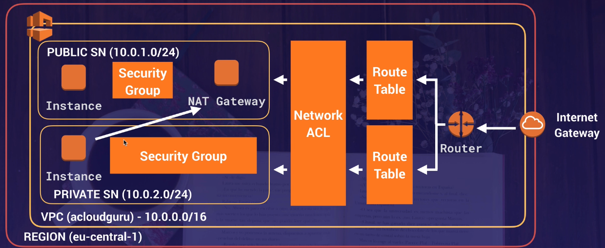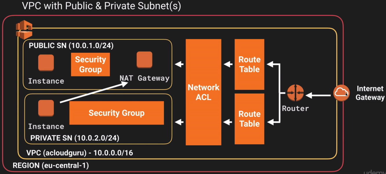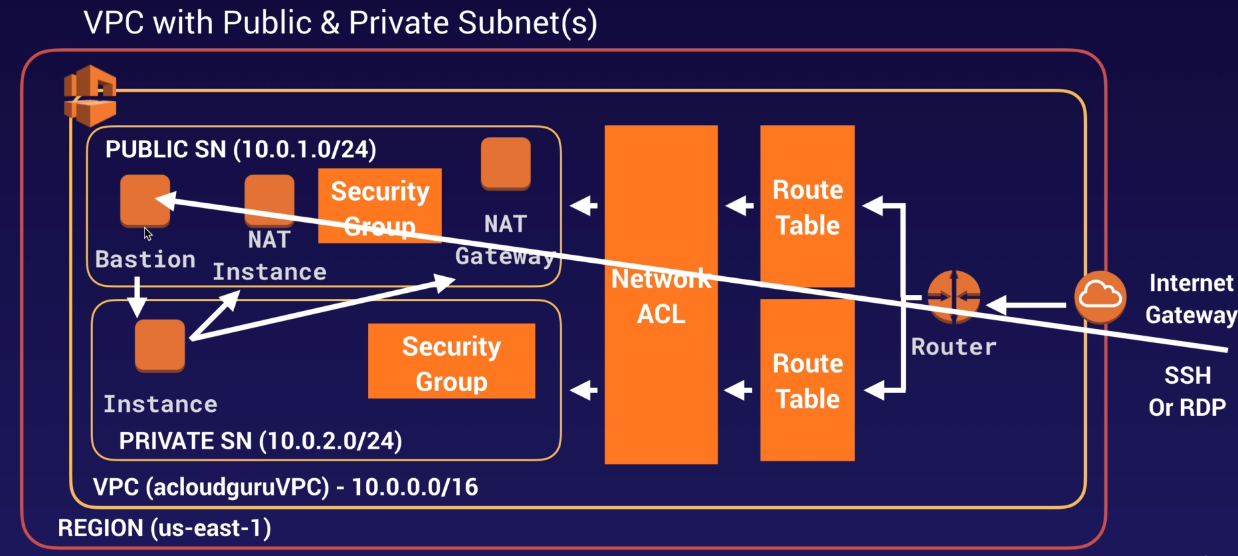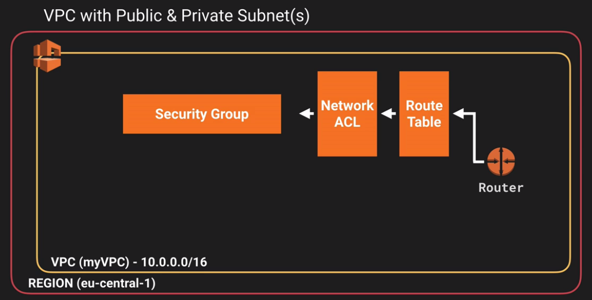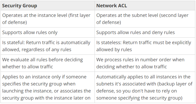 Security Group Network ACL Operates at the instance level (first layer of defense) Operates at the subnet level (second layer of defense) Supports allow rules only Supports allow rules and deny rules Is stateful: Return traffic is automatically allowed, regardless of any rules Is stateless: Return traffic must be explicitly allowed by rules We evaluate all rules before deciding whether to allow traffic We process rules in number order when deciding whether to allow traffic Applies to an instance only if someone specifies the security group when launching the instance, or associates the security group with the instance later on Automatically applies to all instances in the subnets it’s associated with (backup layer of defense, so you don’t have to rely on someone specifying the security group)
