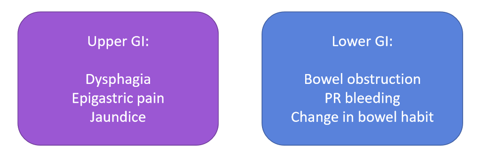 State 3 symptoms that would indicate an upper GI malignancy and 3 symptoms that would indicate a lower GI malignancy