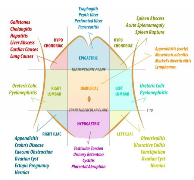 Remind yourself of the quadrants of the abdomen and try and suggest one condition that could cause pain in that area