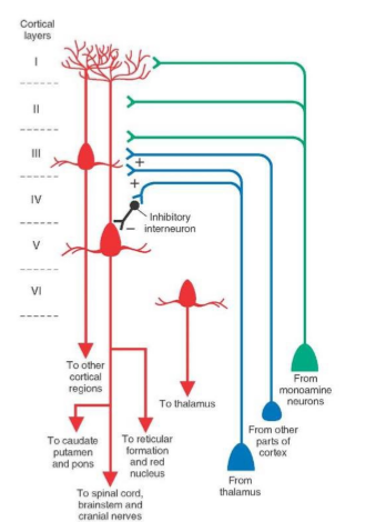 Most output from the cortex are via which neurones?