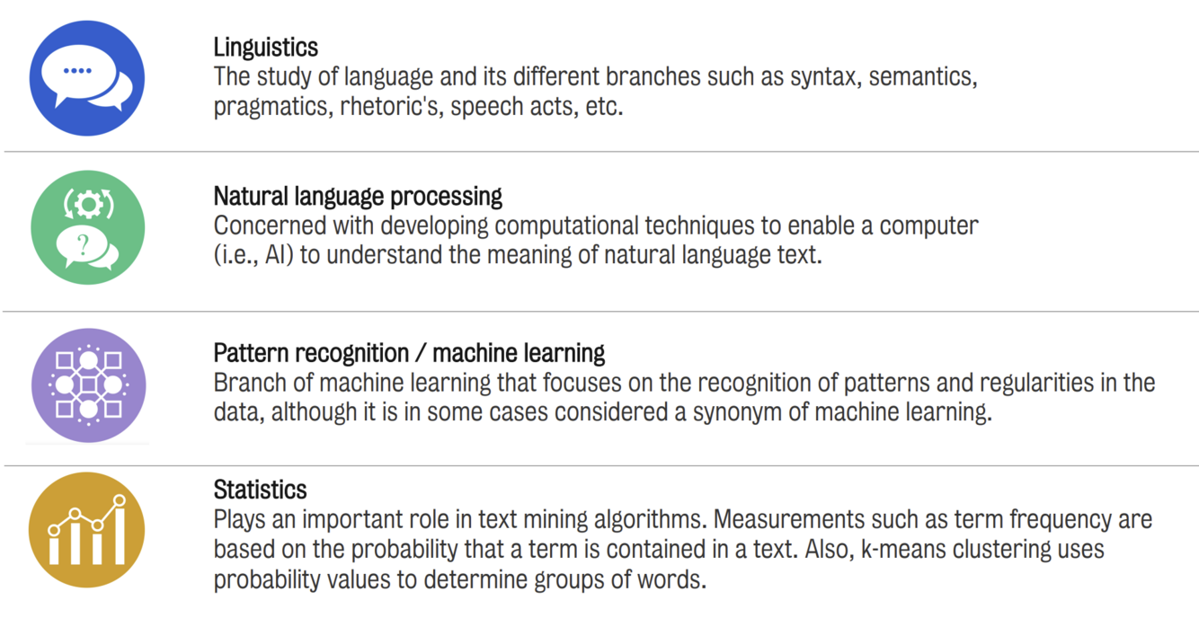 How does “text mining” relate to linguistics/ Natural language processing/ ML/ Statistics?