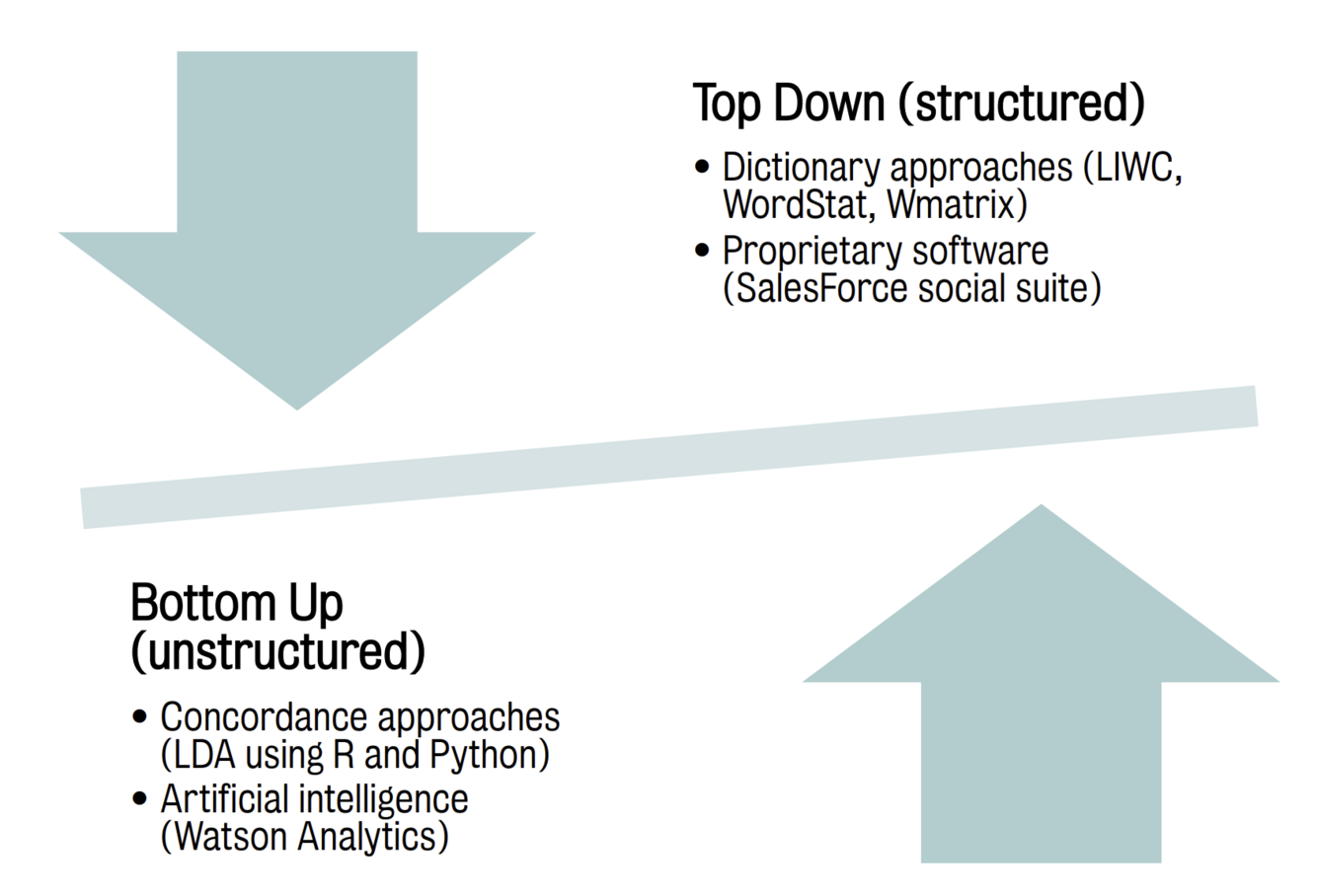 Top-down = you use a dictionary or predefined coding scheme to look for specific things in the data, so it’s more deductive.