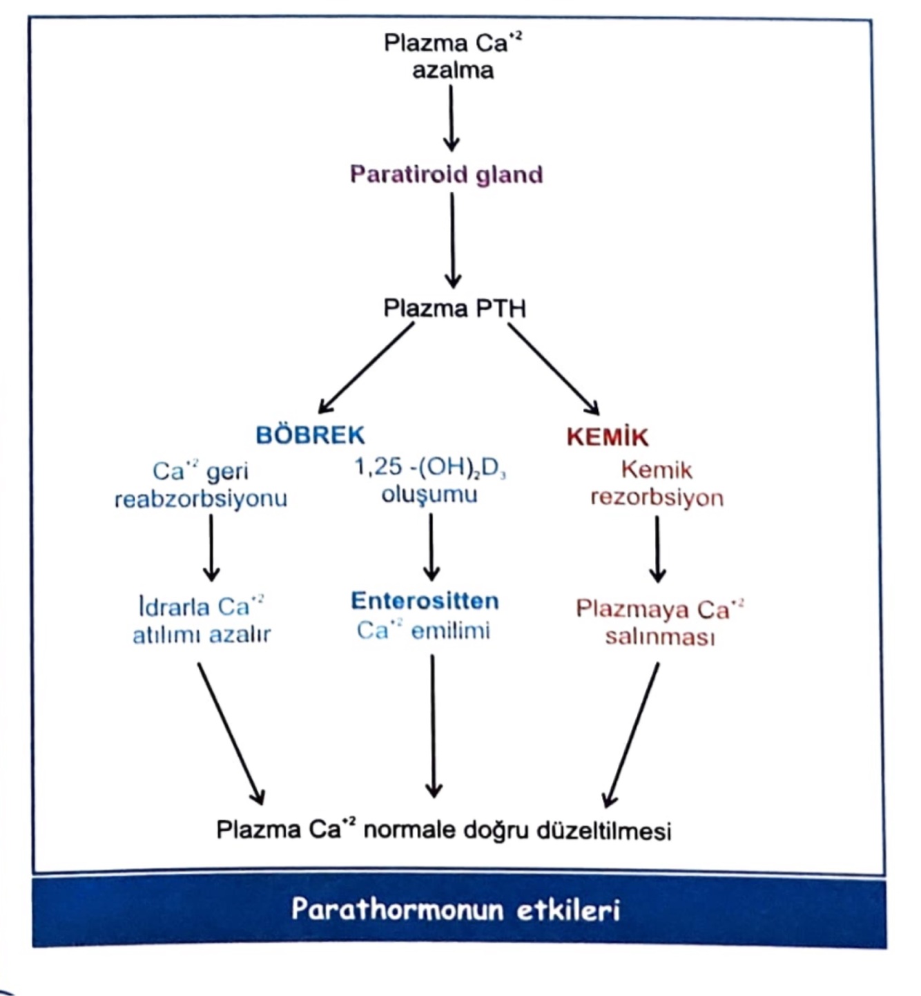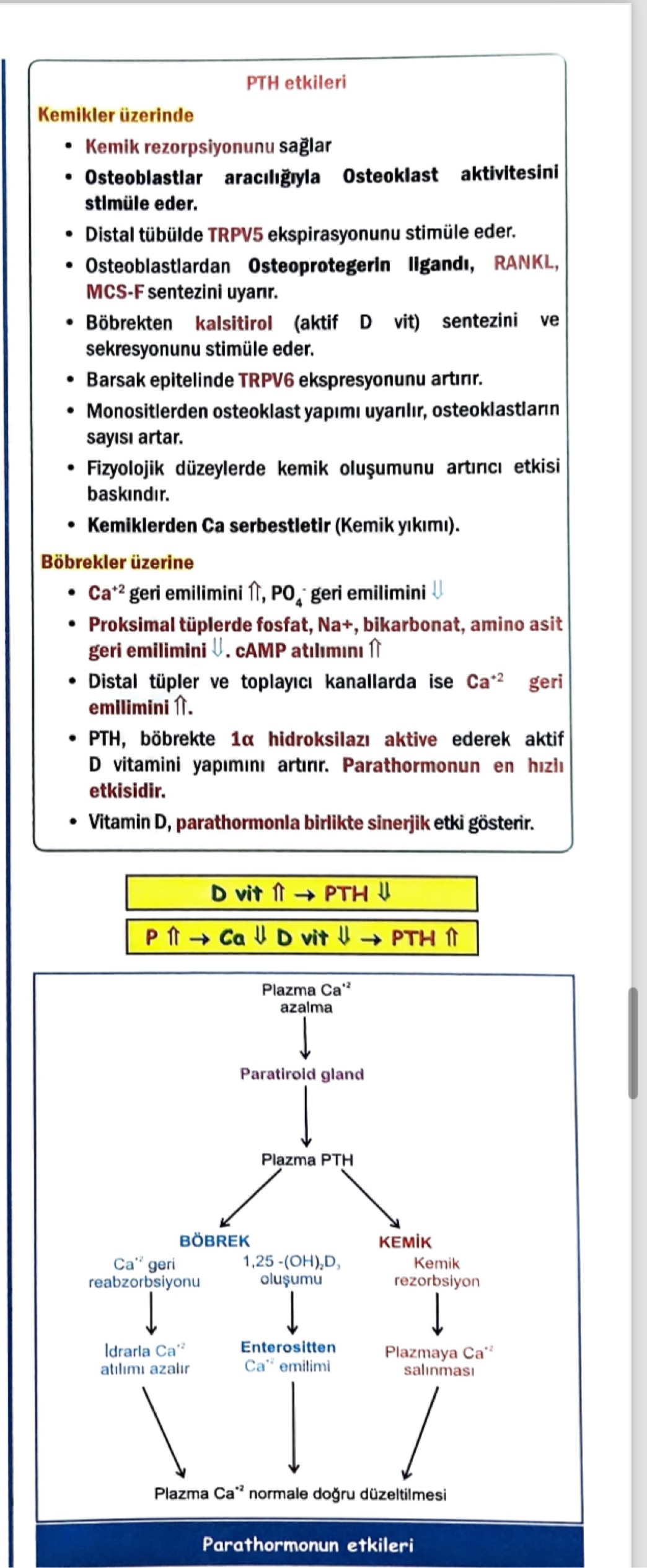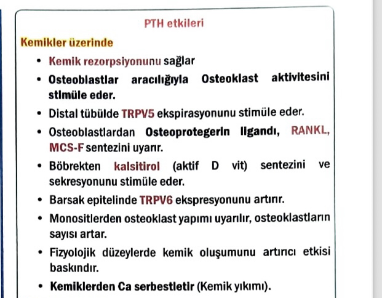 Kemik rezorpsiyonunu sağlar, osteoblastlar aracılığıyla osteoklast aktivitesini stimüle eder, distal tübülde TRPV5 ekspirasyonunu stimüle eder, osteoblastlardan osteoprotegerin ligandi, RANKL, MCS-F sentezini uyandırır, böbrekten kalsitriol (aktif D vit) sentezini ve sekresyonunu stimüle eder, barsak epitelinde TRPV6 ekspresyonunu artırır, monositlerden osteoklast yapımını uyandırır, osteoklastların sayısı artar, fizyolojik düzeylerde kemik oluşumunu artırıcı etkisi baskındır, kemiklerden Ca serbestletir (kemik yıkımı).