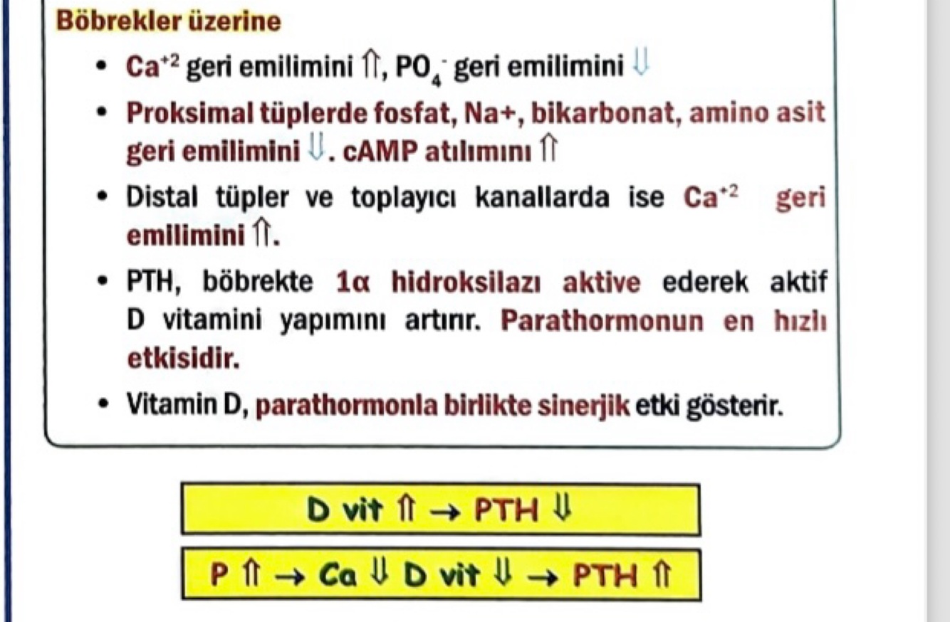 Ca²⁺ geri emilimini artırır, PO₄³⁻ geri emilimini azaltır, proksimal tüplerde fosfat, Na⁺, bikarbonat, amino asit geri emilimini azaltır , distal tüpler ve toplayıcı kanallarda Ca²⁺ geri emilimini artırır, böbrekte 1α-hidroksilazı aktive ederek aktif D vitamini yapımını artırır.