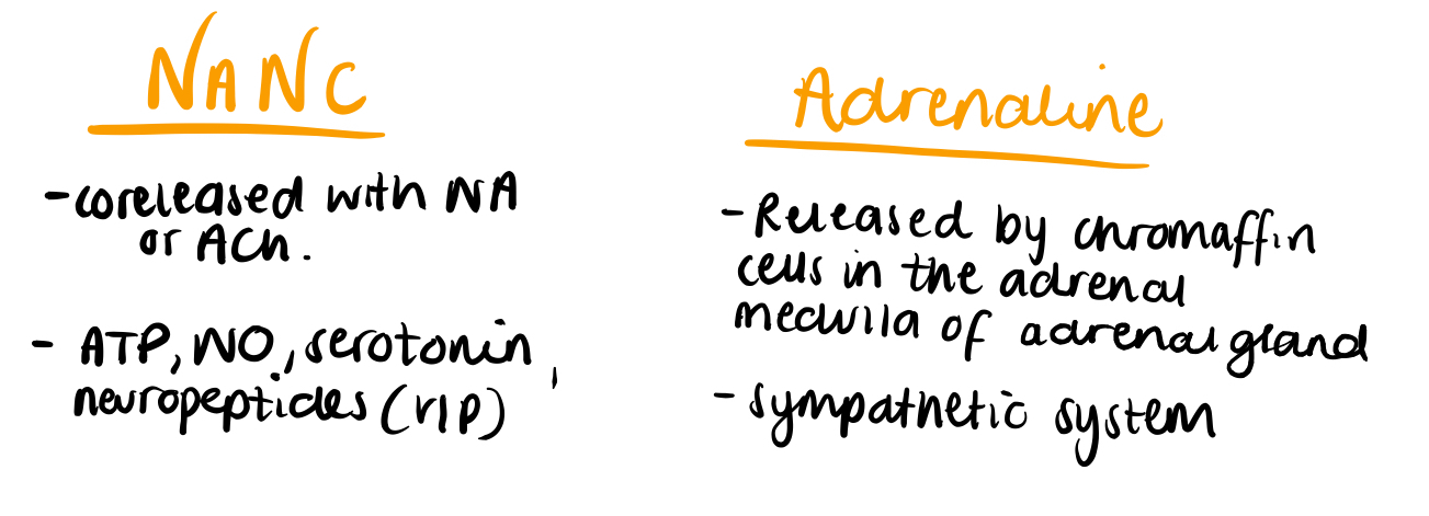 • Whole cell depolarised by pre-ganglionic neurone, vesicles contain A fuse with membrane and release adrenaline into blood stream to act on adrenoreceptors
