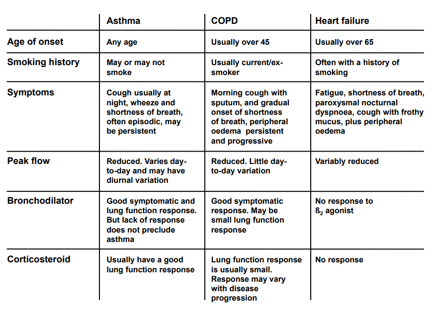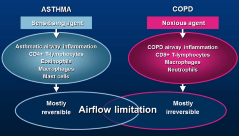 (pic). Asthma = Th2 driven disease characterised mainly by eosinophils - give steroids. COPD mainly neutrophils, steroids don’t help.