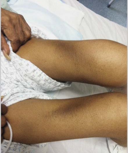 Wheeze, tachypnoea, prolonged expiration, use of accessory muscles, pursed lip breathing, hyper-inflated lungs, cyanosis, heart failure. BMI, 6 min walk test and degree of obstruction predicts mortality in COPD. Dahl’s sign (pic): areas of darkened (hyperpigmentation) and thickened (hyperkeratotic) skin on lower thighs and elbows from chronic tripod position.