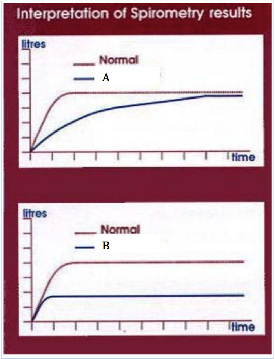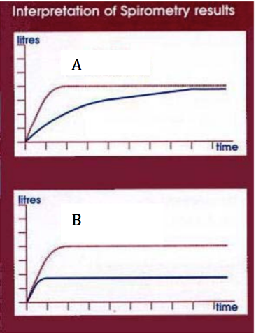 The red line indicates normal spirometry results. What do the blue lines indicate in A and B?