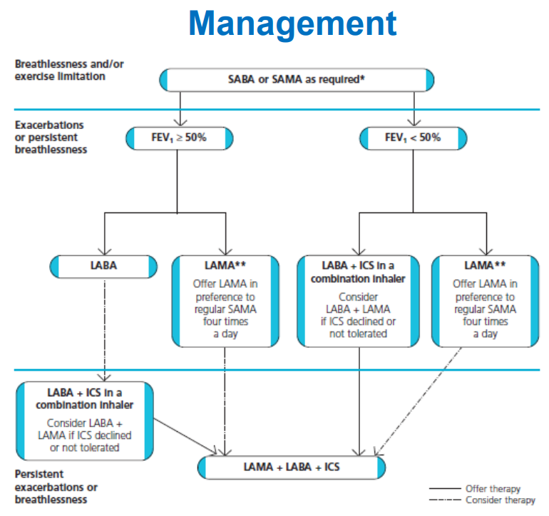 Stablisation. Health education e.g. smoking cessation!! No existing medication for COPD modifies the long-term decline in lung function, so pharmacotherapy for COPD is used to decrease symptoms and/or complications/exacerbations.