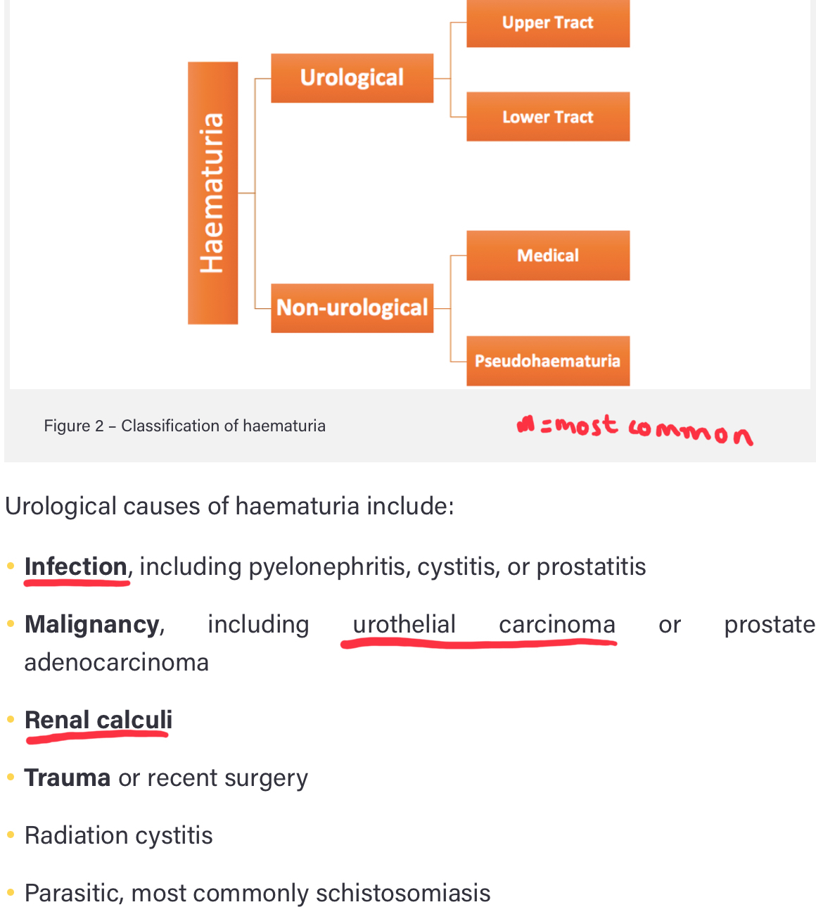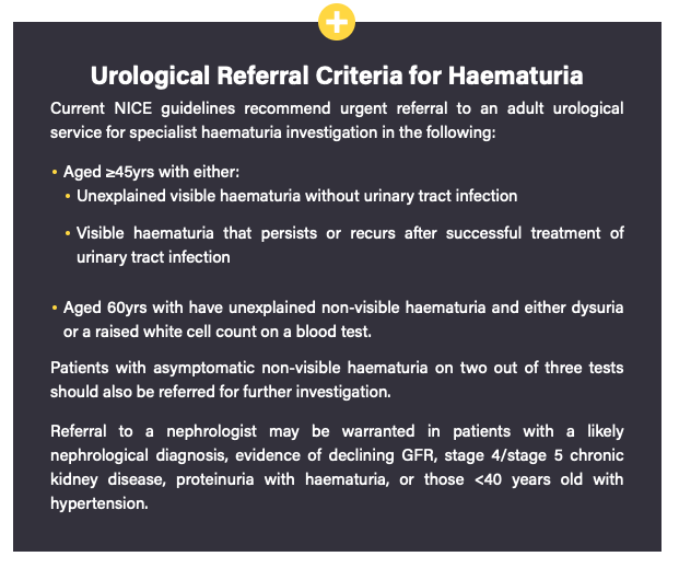 - Pseudohaematuria: foods like beetroot, medication (such as rifampicin or methyldopa), hyperbilirubinuria, myoglobinuria