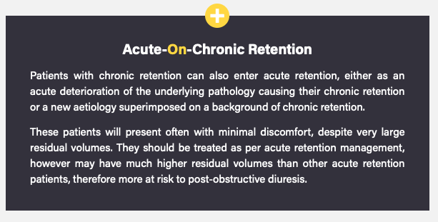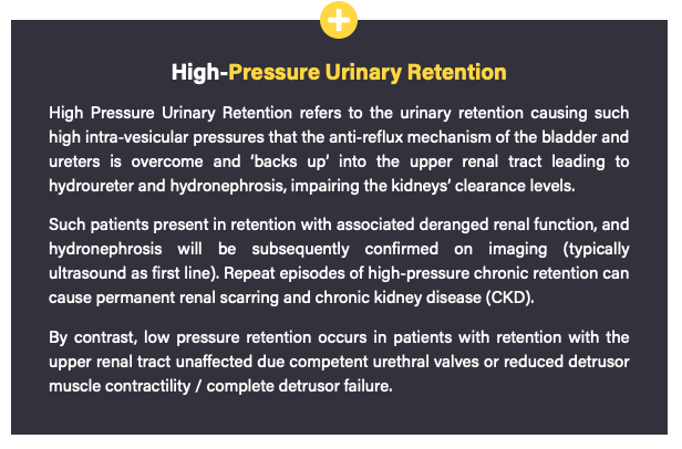- High-pressure urinary retention: keep in place until definitive treatment (e.g TURP) to prevent further retentions that could cause an AKI and eventually CKD