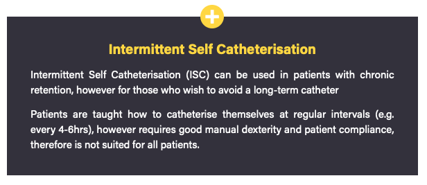 - Treat underlying cause e.g Tamsulosin for BPH