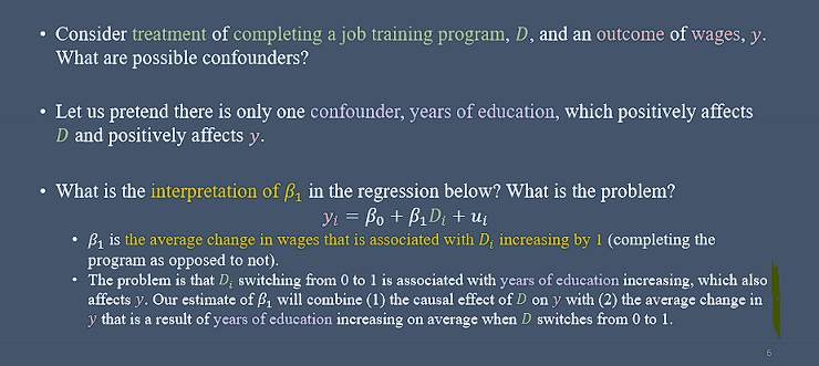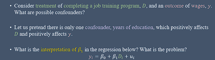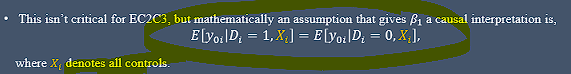 meaning that holding fixed controls, variation in treatement is not associated with any other determinant of the outcome changing, and thus we isolate th causal effect of treatement on the outcome