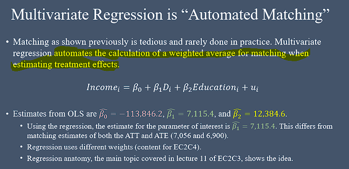 Multivariate regression automates the calculation of a weighted average for matchign when estimating treatement effects