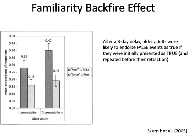 Information that is initially presented as true is believed to be true even after correction. This belief increases with repetition (i.e., familiarity increases belief in false information)