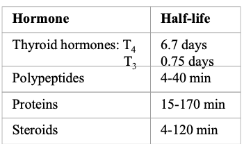 Concentration of circulation hormoens dep on: rate of release, speed of inactivation, removal from body
