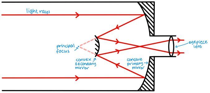 Draw an annoted ray diagram for a Cassegrain telescope.