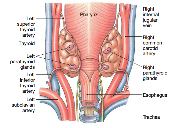 There are 4 small parathyroid glands located on the back of the thyroid gland