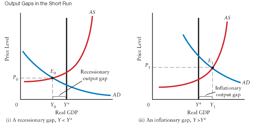 A recessionary gap, shown in part (i), occurs when actual output is less than potential GDP. An inflationary gap, shown in part (ii), occurs when actual output is greater than potential GDP.