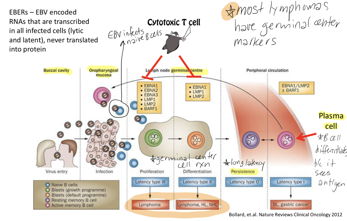 Why do most EBV-associated lymphomas have germinal center markers?