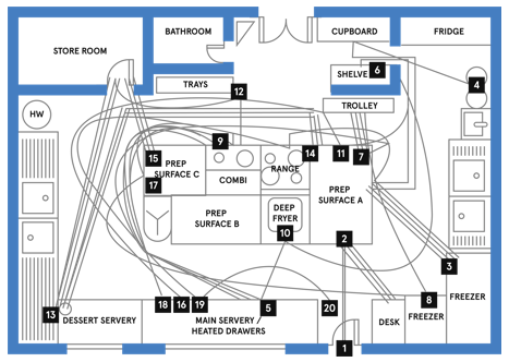 Spagetti diagram: nummer stappen uit procesflow en zet nummers in een plattegrond.