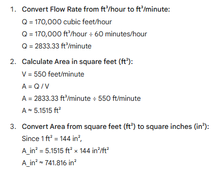 What is the cross sectional area of a duct that will pass 170,000 cubic feet/hour of combustion air at a velocity of 550 feet/minute?