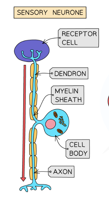 A stimulus is detected by receptor cells and an electrical impulse is sent along a sensory neurone