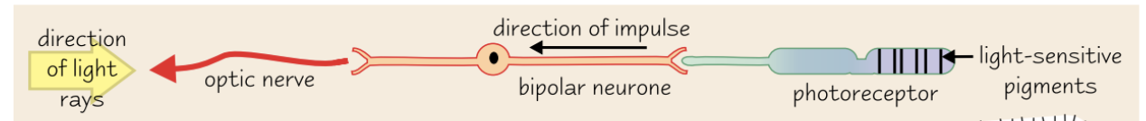 Bipolar neurones connect photoreceptors to the optic nerve, which takes impulses to the brain