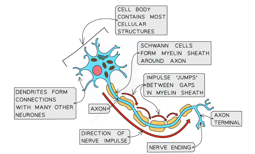Cell body, shwann cell, dendrites, axon, axon terminal, myelin sheath
