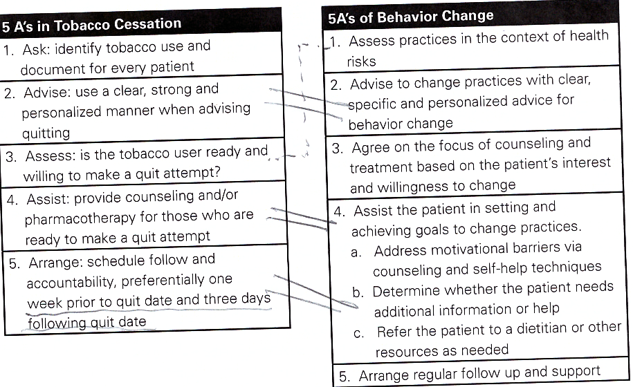 What are the five A’s for counselling patients on Behavioural Change (not smoking cessation) (including on physical activity)