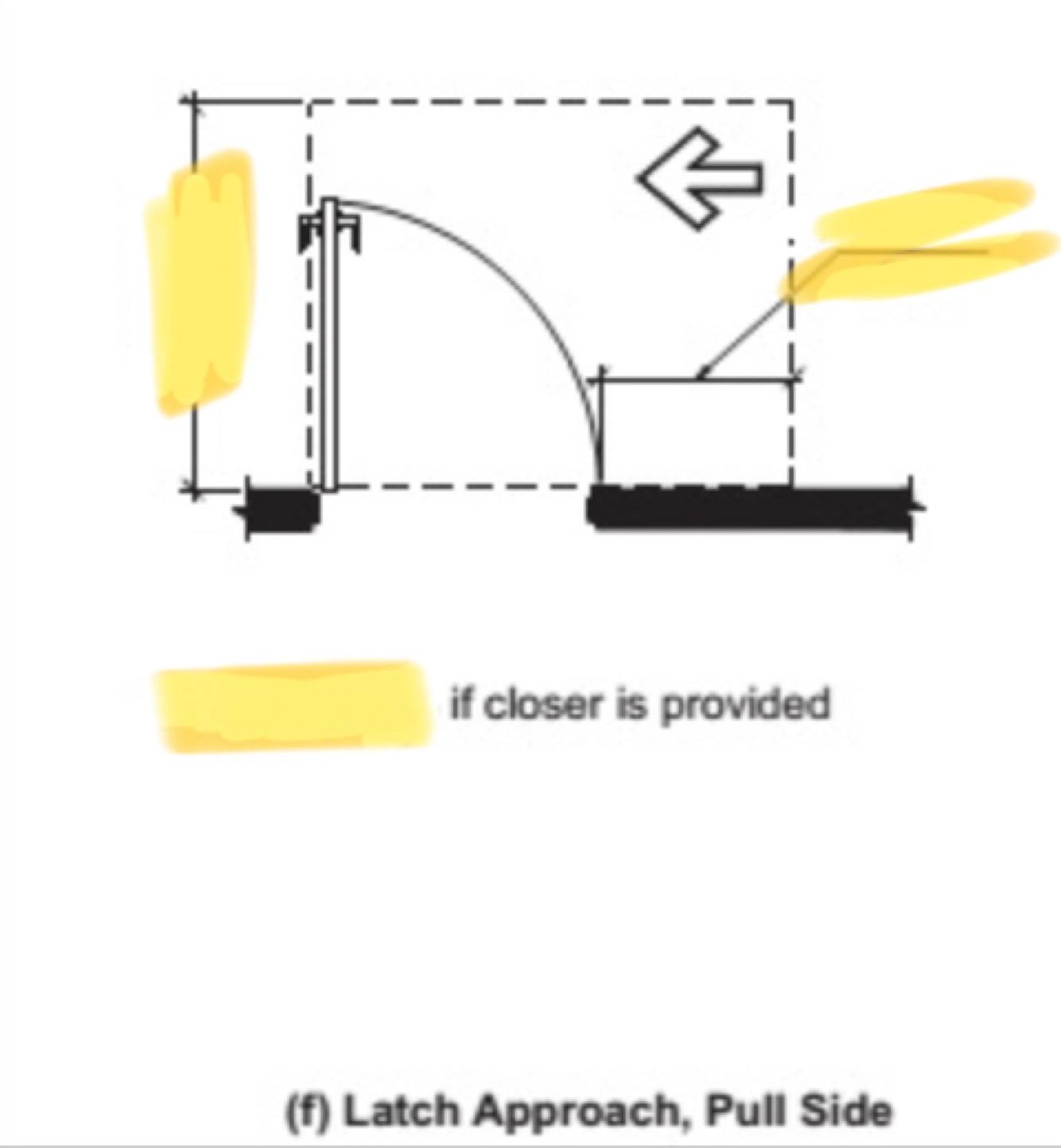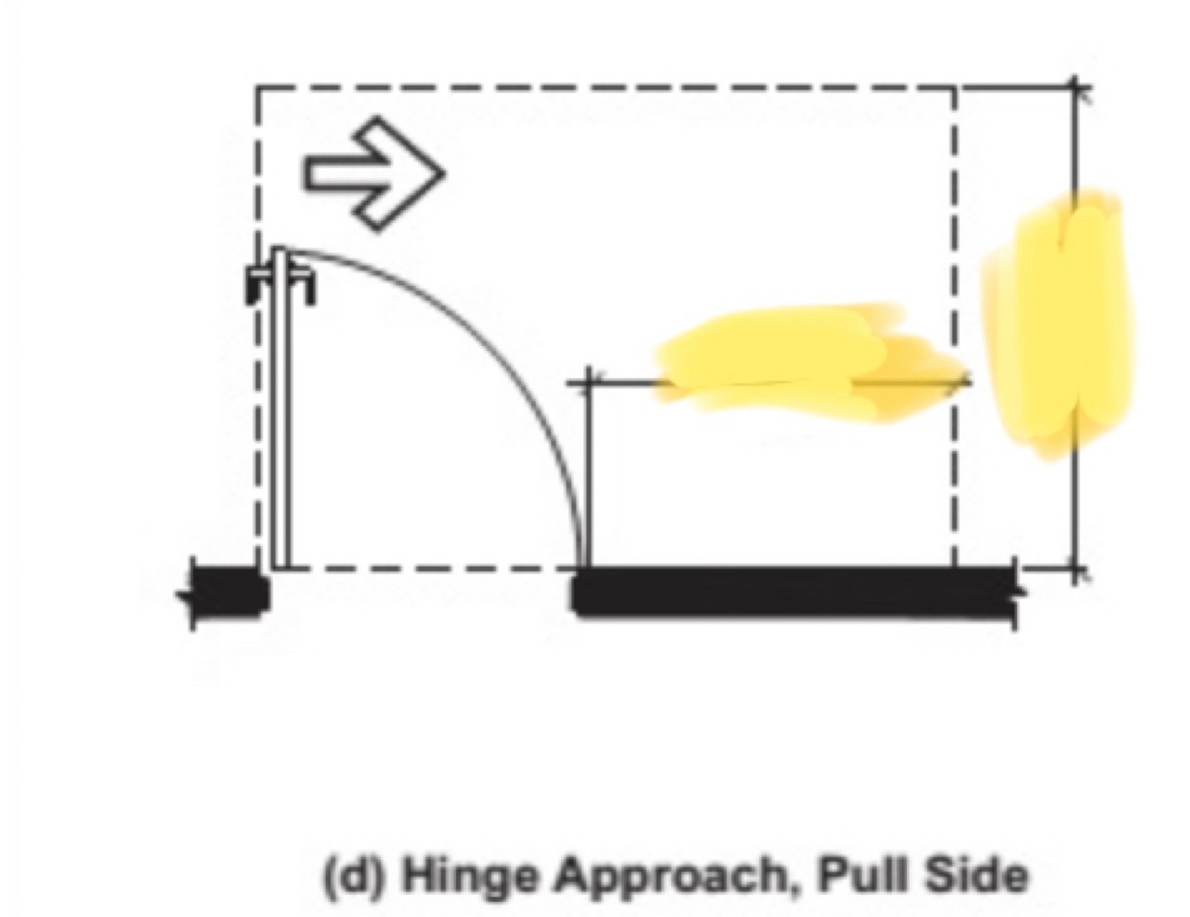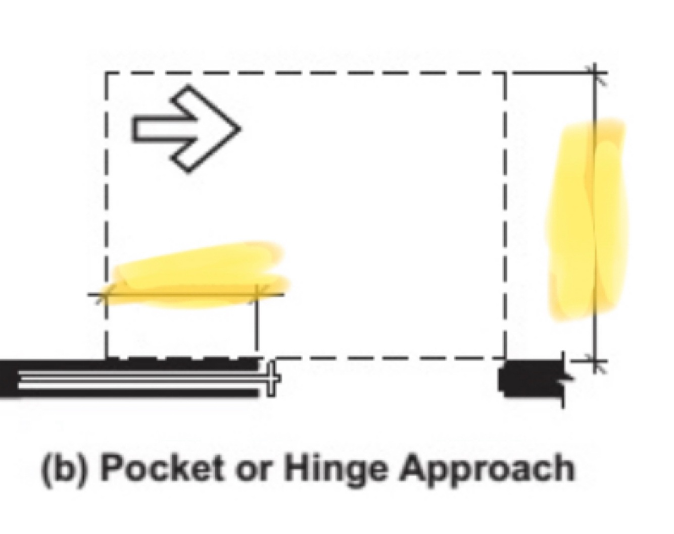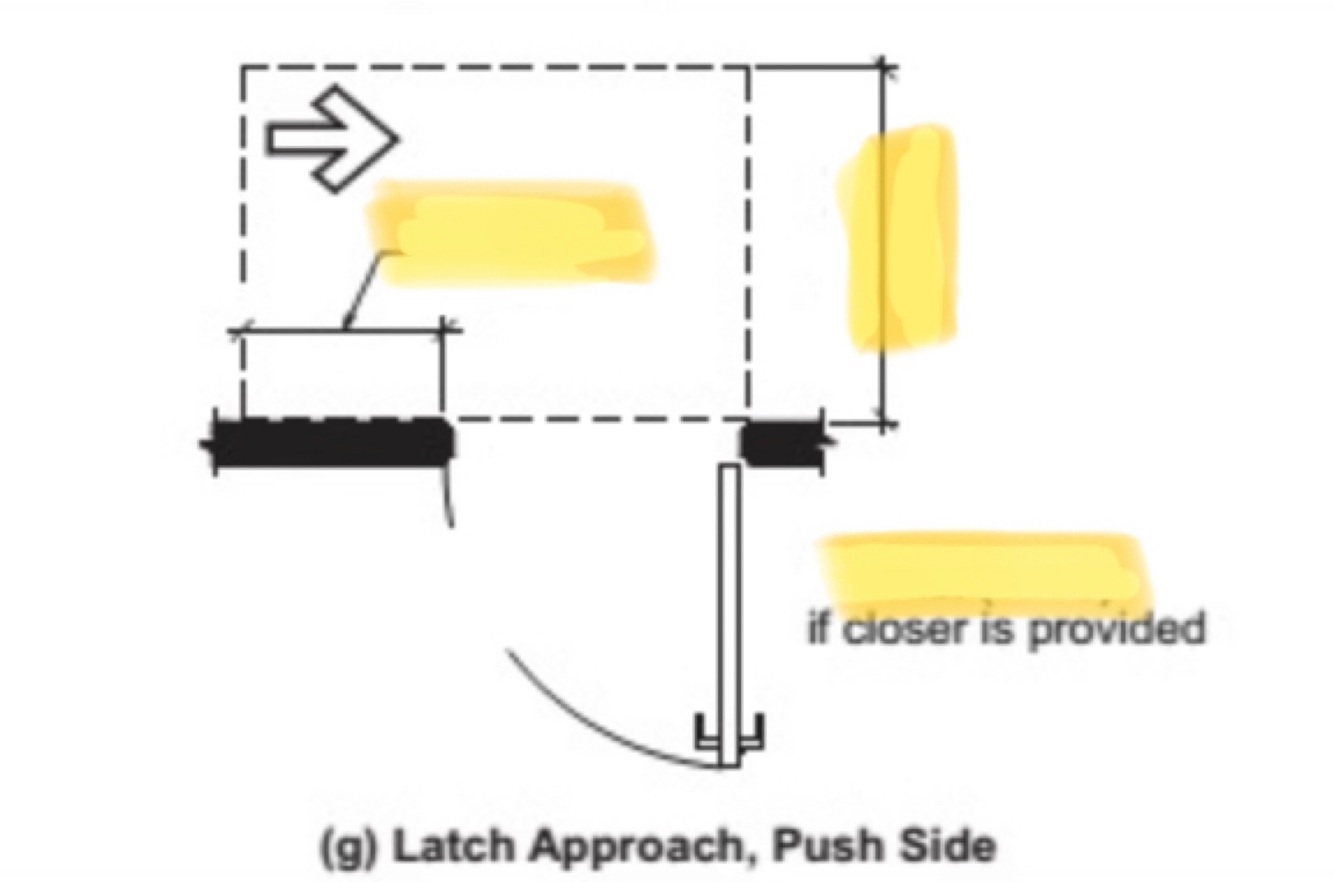 42’’ perpendicular (add 6’’ if closer and latch provided) , 22’’ parallel (add 12’’ if closer and latch provided Beyond hinge side)