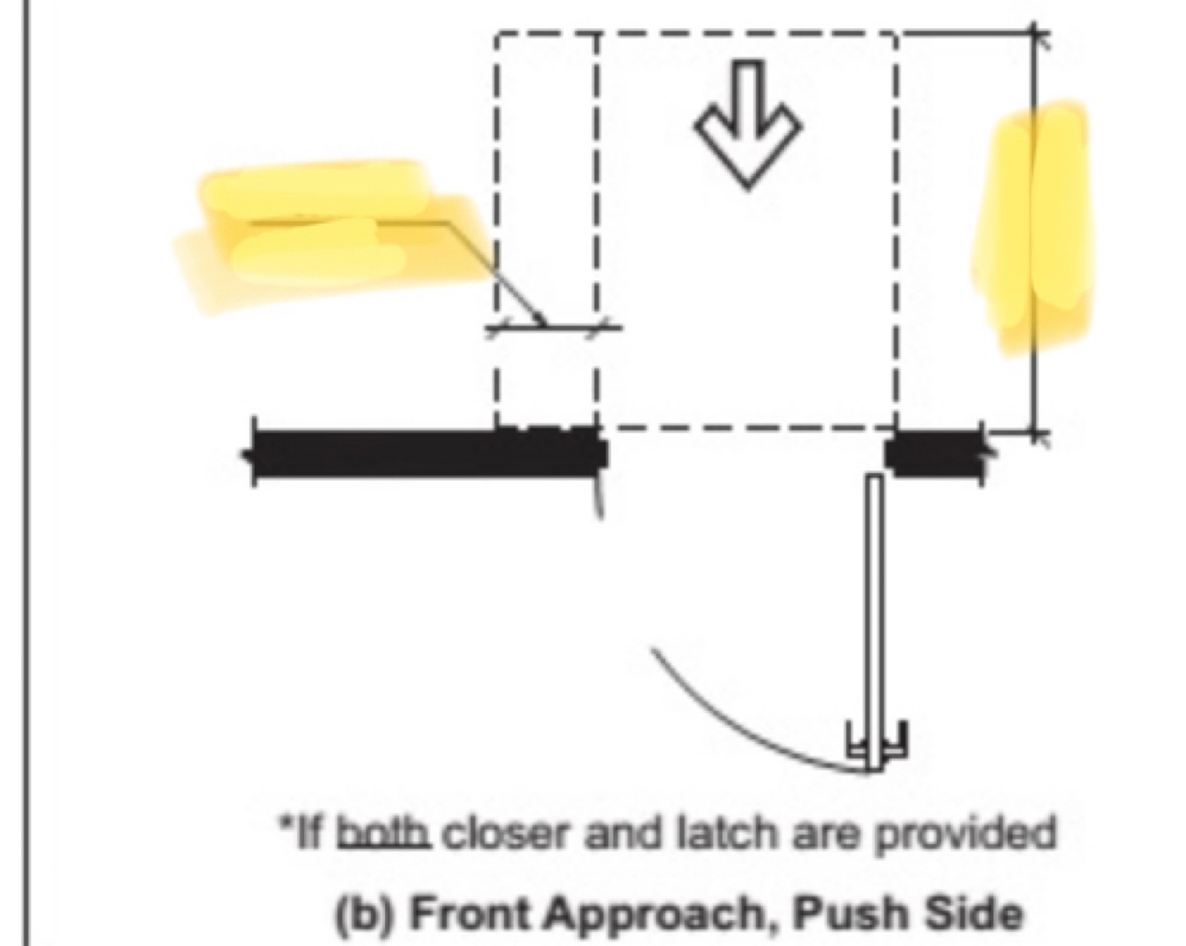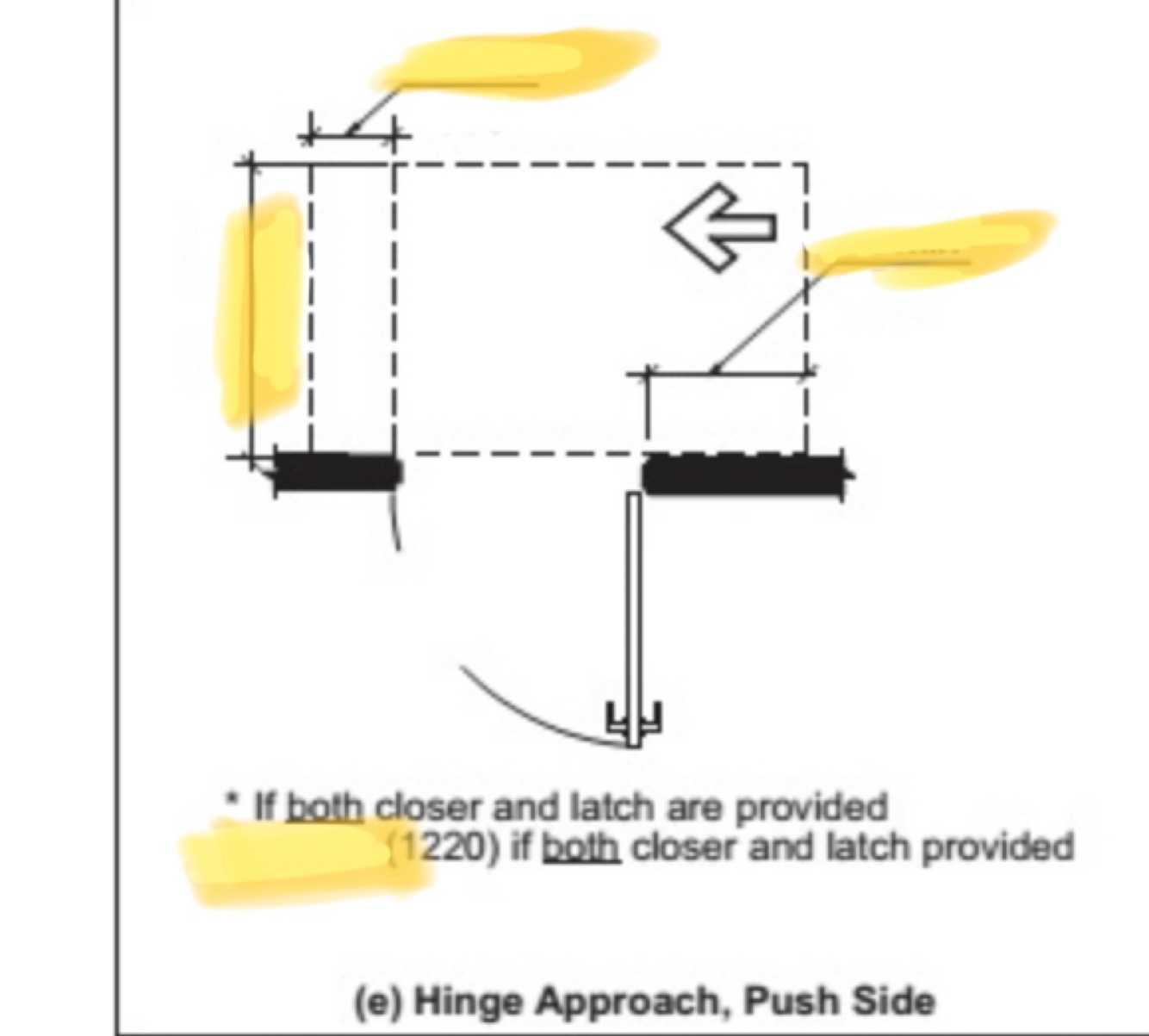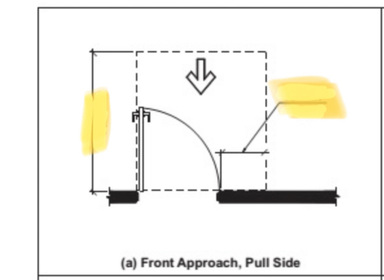 42’’ perpendicular (add 6’’ if closer and latch provided) , 22’’ parallel (add 12’’ if closer and latch provided Beyond hinge side)