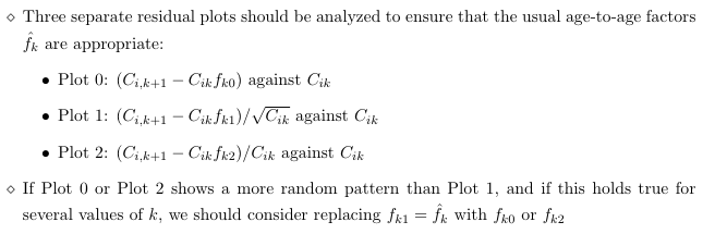 Plot the normalized residuals against the following 3 variables. If the residuals for each graph are randomly scattered around zero with a roughly constant variance, we can assume the following: Incremental age - growth curve appropriate expected loss in each increment age - variance/mean ratio is constant calendar year - no calendar year effects