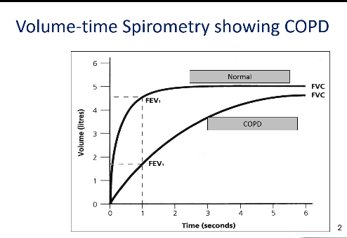 WHat would you expect to see in a volume time spirometry in COPD patients (imagine in your head)?