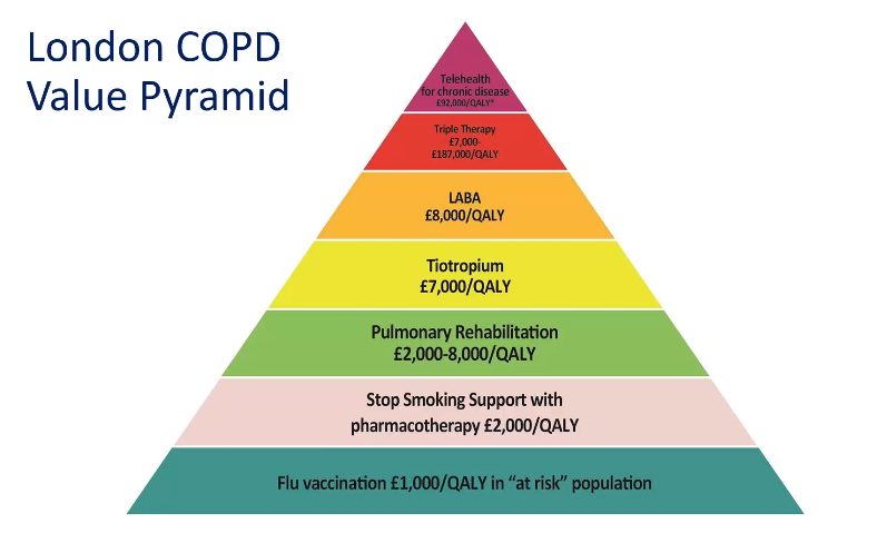 Widely used for its impactful message about the comparative value of interventions for COPD that rebalances the value accorded to flu vaccination, stop smoking as a treatment, pulmonary rehabilitation, inhaled medicines and telemedicine using cost per quality adjusted life year (QALY)