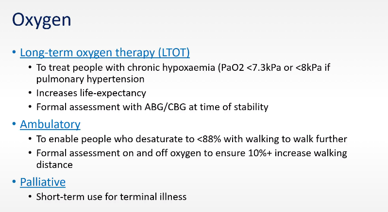 -Short acting bronchodilators -Long acting bronchodilators (LABA and LAMA) -Inhaled corticosteroids (ICSO -Theophylline and roflumilast -Low dose abx -long term oxygen therapy and ambulatory oxygen