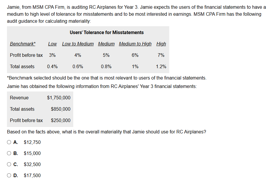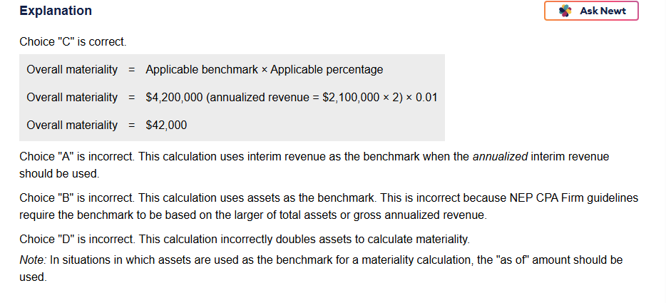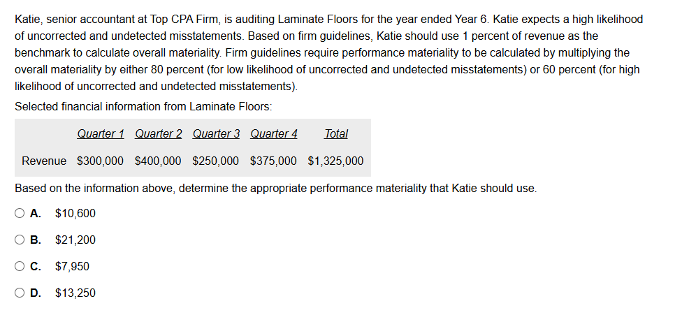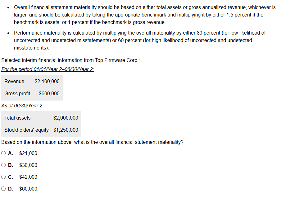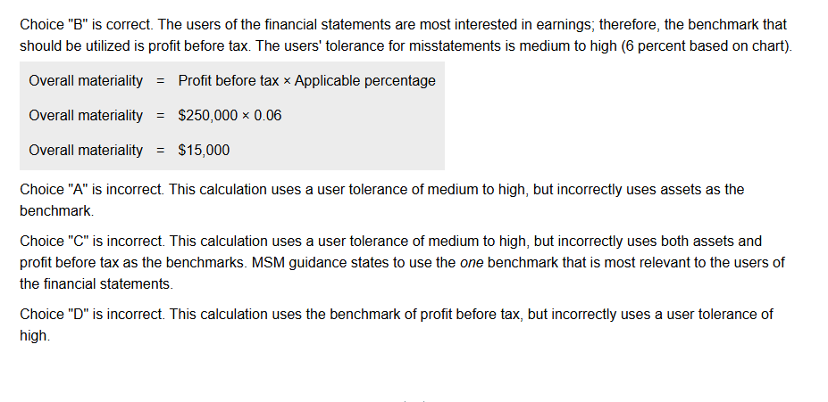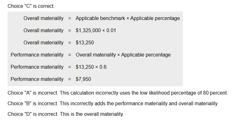 Choice “D” is incorrect. Performance materiality should not be higher than overall materiality.