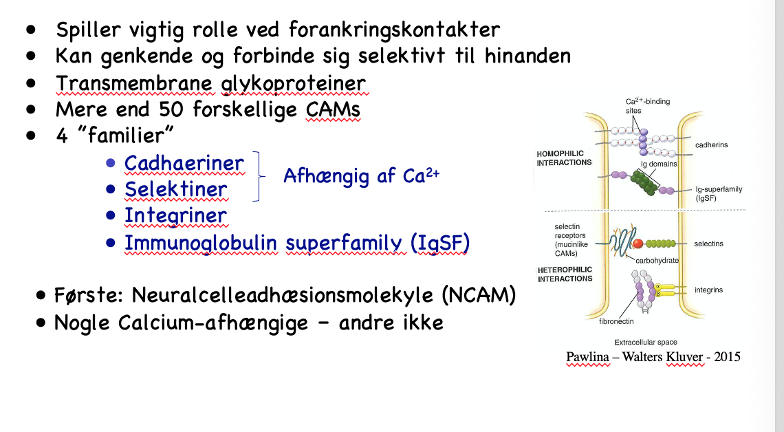 Celle-adhæsionsmolekyler- CAMS: Rolle, nævn de 4 familier, og om de er calciumafhængige