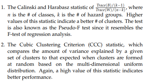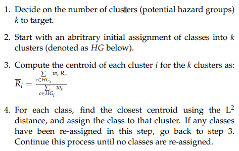 K-means maximizes the equivalent of R2 from linear regression, which means maximizing the percentage of total variation explained by the hazard groups. This is equivalent to stating that k-means minimizes the within variance and maximizes the between variance, which means the hazard groups will be homogeneous and well separated.