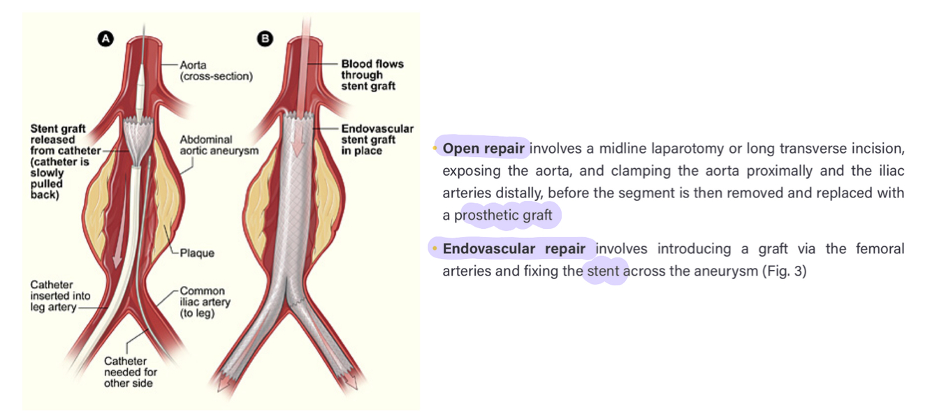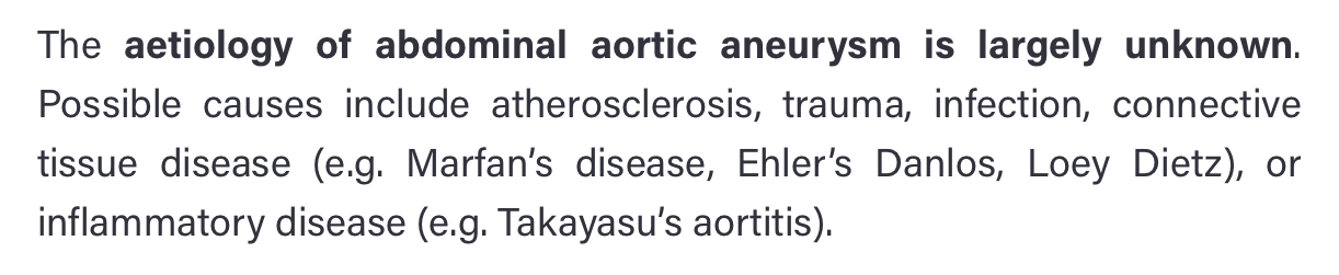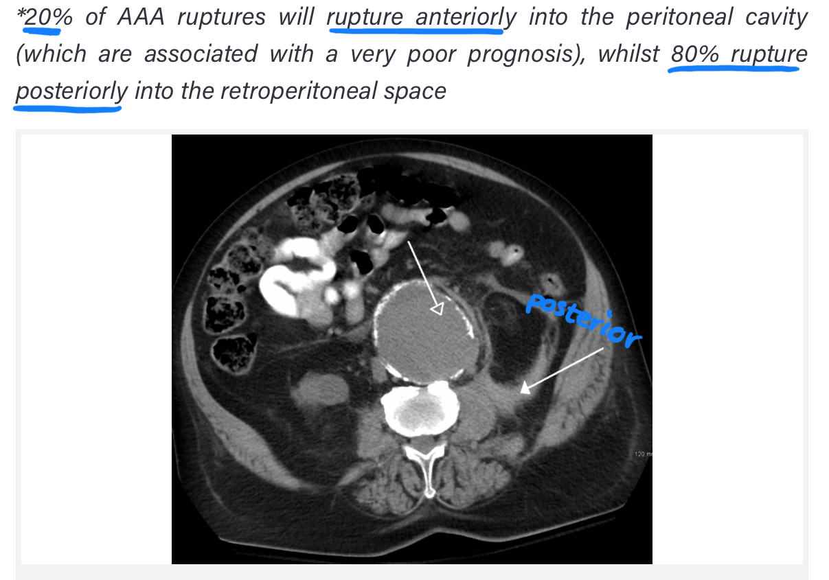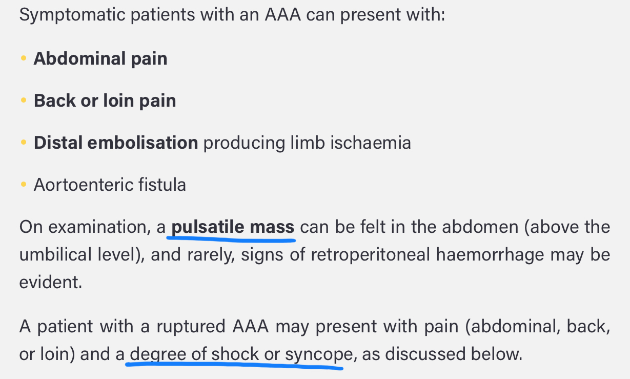- AAA: dilatation of the AA greater than 3cm, every 8mm increase there is 34% more chance of death
