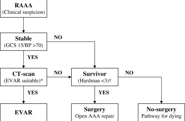Transfer to local vascular unit: if unstable immediate theatre for open surgical repair, if stable CT angiogram to determine if suitable for endovascular repair