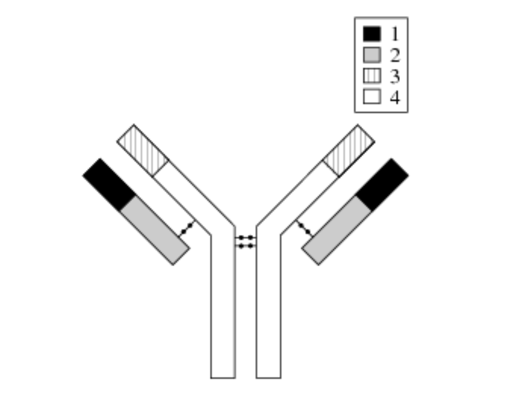 where are the long chain, short chains, and variable regions on an antibody