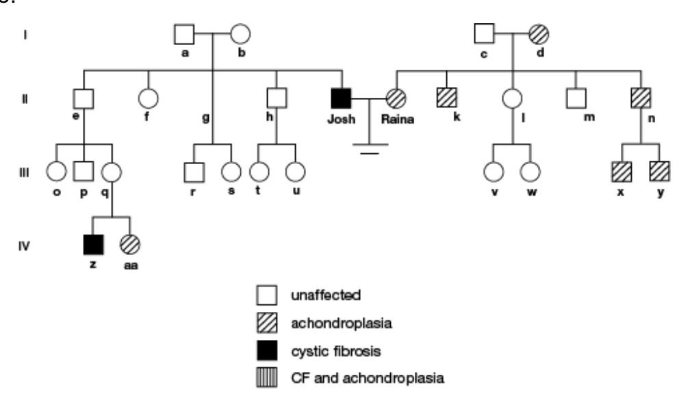 Remember to answer the three basic questions before tackling any pedigree problem, and remember that in pedigrees showing two different conditions, the three questions must be answered separately for each condition. First, is the condition/disease caused by a dominant allele or a recessive allele? If the disease skips generations it is most likely recessive. Based on this, we can conclude that CF is recessive and achondroplasia is dominant (choices B and C are wrong). Second, is the disease allele carried on an autosome or on one of the sex chromosomes? If significantly more men than women are affected, the disease is most likely sex-linked. Based on the pedigree, we can conclude that both CF and achondroplasia are autosomal (choice D is correct and A is wrong). Since both conditions are autosomal, the third question (“If sex-linked, is the disease carried on the X chromosome or the Y chromosome?”) is irrelevant and unnecessary in this case.