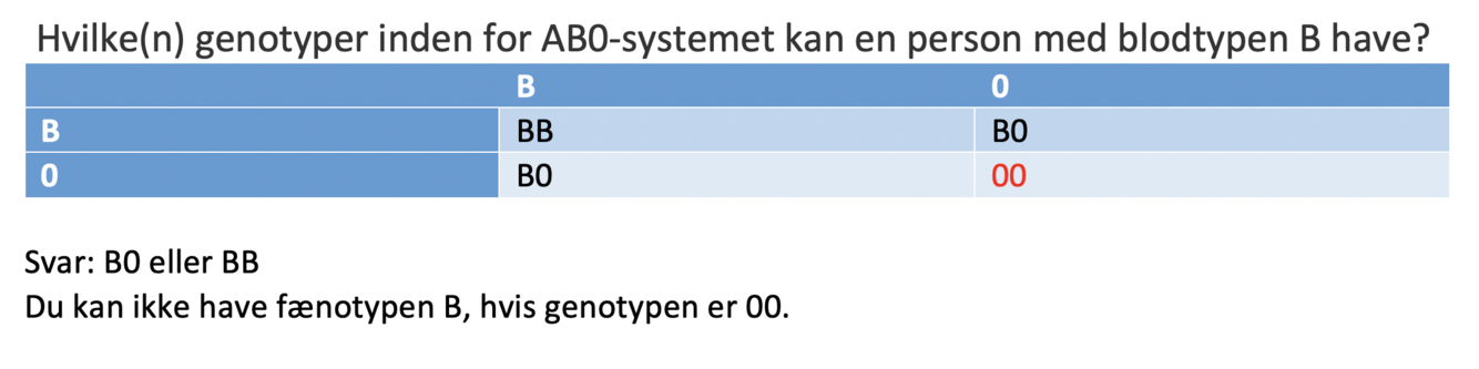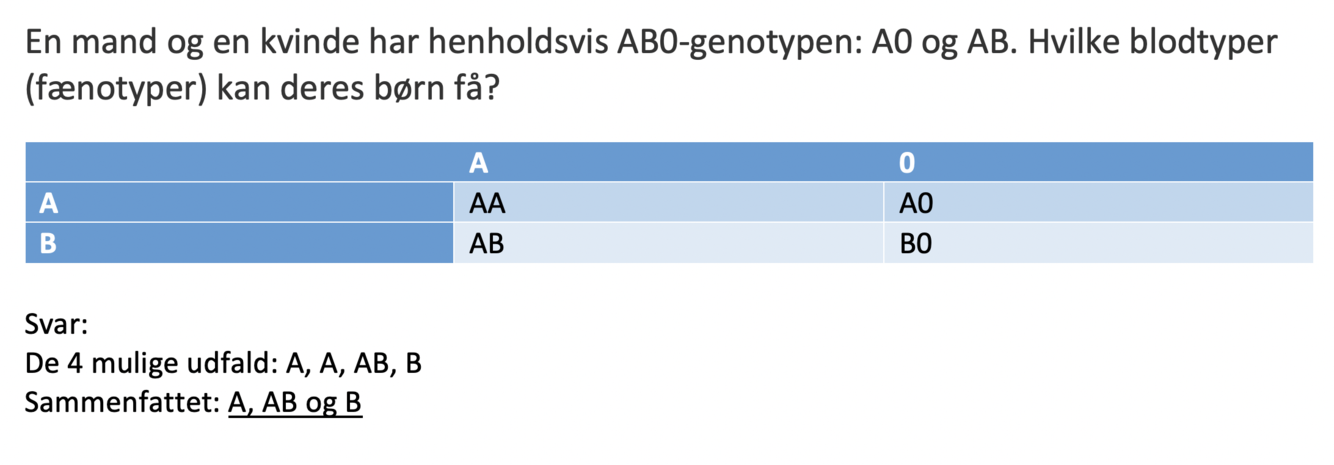 Opgave 83. En mand og en kvinde har henholdsvis AB0-genotypen: A0 og AB. Hvilke blodtyper (fænotyper) kan deres børn få?