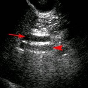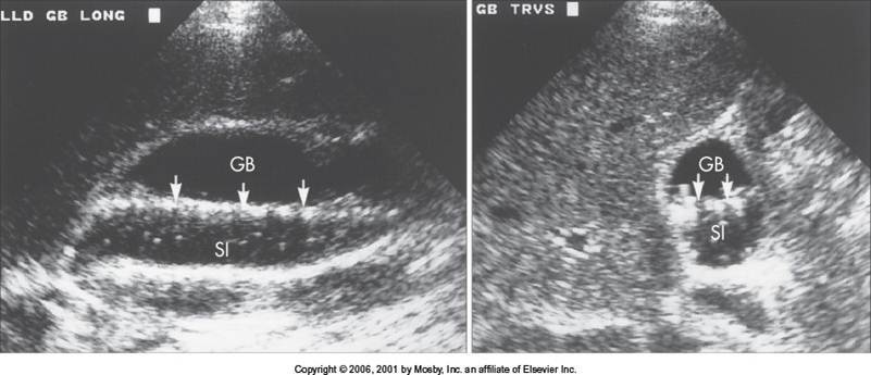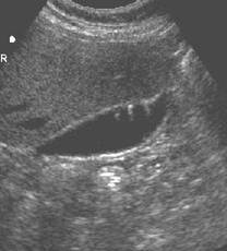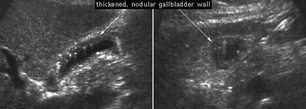 (Thickened gallbladder wall with comet tail artifact)