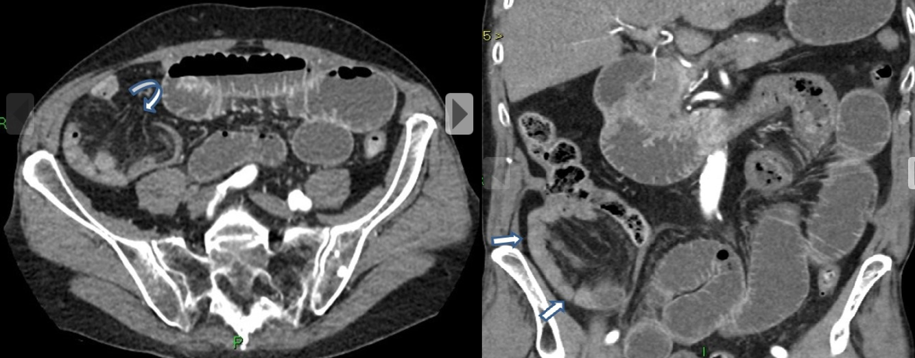 Massa inflamatória sugestiva de abscesso contendo nível liquido e densificação da gordura do mesentério adjacente.